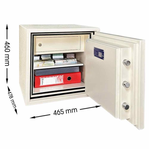 Зовнішні розміри (ВхШхГ, мм):460 х 465 х 478 Внутрішні розміри (ВхШхГ, мм):354 х 359 х 301 Тип замку: Ключовий WITTKOPP Німеччина Об'єм(л): 38. Вага(кг): 74 Кількість полиць: 1 Касовий відсік: трейзер Вогнестійкість: клас LFS 60P по ДСТУ EN 15659 Стійкість до злому: ДСТУ EN 14450, клас S2 Країна виробник: Україна Основні характеристики:• особливості конструкції – двостінна конструкція, простір між зовнішнім та внутрішнім корпусами наповнений теплоізоляційним напов..